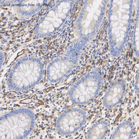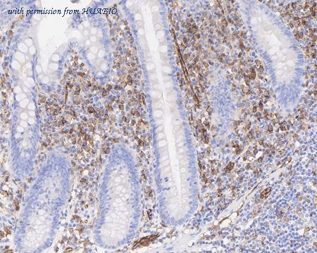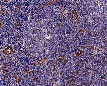 Immunohistochemical analysis of paraffin-embedded human appendix tissue with Rat anti-CD31 antibody (HA610349) at 1/1,000 dilution. The section was pre-treated using heat mediated antigen retrieval with Tris-EDTA buffer (pH 9.0) for 20 minutes. The tissues were blocked in 1% BSA for 20 minutes at room temperature, washed with ddH2O and PBS, and then probed with the primary antibody (HA610349) at 1/1,000 dilution for 1 hour at room temperature. The detection was performed using an HRP conjugated compact polymer system. DAB was used as the chromogen. Tissues were counterstained with hematoxylin and mounted with DPX.