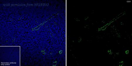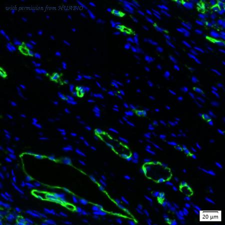 Immunofluorescence analysis of paraffin-embedded human tonsils tissue labeling CD31 with Rabbit anti-CD31 antibody (HA720220F) at 1/200 dilution. The section was pre-treated using heat mediated antigen retrieval with Tris-EDTA buffer (pH 9.0) for 20 minutes. The tissues were blocked in 10% negative goat serum for 1 hour at room temperature, washed with PBS, and then probed with the primary antibody (HA720220F, green) at 1/200 dilution overnight at 4 ℃, washed with PBS. Goat Anti-Rabbit IgG H&L (iFluor™ 488, HA1121) was used as the secondary antibody at 1/1,000 dilution. Nuclei were counterstained with DAPI (blue).