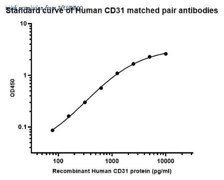 Sandwich ELISA analysis of Human CD31 matched pair antibodies Elisa assay was performed by coating wells of a 96-well plate with 50 µl per well of capture antibody (HA722906) diluted in carbonate/bicarbonate buffer, at a concentration of 2 µg/mL overnight at 4℃. Wells of the plate were washed, blocked with 150 µl 0.05% tween-20 1%BSA blocking buffer, and incubated with serial diluted Recombinant Human CD31 protein (HA210891) starting from 10,000 pg/ml to 0 pg/ml and detect antibody (HA722907, Biotin, 0.1 µg/ml) for 1 hour at 30℃ with shaking. Then the plate was washed and incubated with 50 µl per well of SA-HRP for 0.5 hour at 30℃ with shaking. Detection was performed using an Ultra TMB Substrate for 10 minutes at room temperature in the dark. The reaction was stopped with sulfuric acid and absorbances were read on a spectrophotometer at 450 nm.