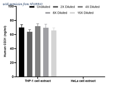 Interpolated concentrations of native CD31 in THP-1 and HeLa extract samples based on a 1,000 µg/ml extract load. The concentrations of CD31 were measured in duplicates, interpolated from the CD31 standard curve and corrected for sample dilution. Undiluted samples are THP-1 extract 3% and HeLa extract 100%. The interpolated dilution factor corrected values are plotted (mean +/- SD, n=2). The mean CD31 concentration was determined to be 68.19 ng/ml in THP-1 extract and undetectable in HeLa extract.