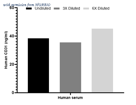 Interpolated concentrations of native CD31in human serum samples. The concentrations of CD31 were interpolated from the CD31 standard curve and corrected for sample dilution. Undiluted samples are human serum 20%. The mean CD31 concentration was determined to be 39.7 ng/mL in human serum.