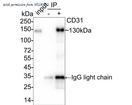 CD31 was immunoprecipitated in 0.2mg THP-1 cell lysate with HA750151 at 2 µg/10 µl beads. Western blot was performed from the immunoprecipitate using HA750151 at 1/1,000 dilution. Anti-Rabbit IgG for IP Nano-secondary antibody (NBI01H) at 1/5,000 dilution was used for 1 hour at room temperature. Lane 1: THP-1 cell lysate (input) Lane 2: Rabbit IgG instead of HA750151 in THP-1 cell lysate Lane 3: HA750151 IP in THP-1 cell lysate Blocking/Dilution buffer: 5% NFDM/TBST Exposure time: 5 seconds