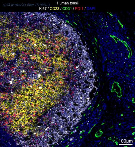 mIHC analysis of human tonsil tissue (Formalin/PFA-fixed paraffin-embedded sections) with Ki67 (IRS036), CD23 (IRS021), CD31 (IRS023) and PD-1 antibody at 1/100 dilution. The immunostaining was performed with the IRISKitCmTSA Kit (900802). Heat mediated antigen retrieval with Tris-EDTA buffer (pH 9.0) for 30 mins at 95℃. DAPI (blue) was used as a nuclear counter stain. Image acquisition was performed with Olympus VS200 Slide Scanner.