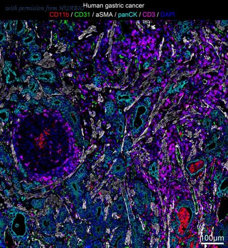 mIHC analysis of human gastric cancer tissue (Formalin/PFA-fixed paraffin-embedded sections) with CD11b (IRS014), CD31 (IRS023), aSMA (IRS012), panCK (IRS010) and CD3 (IRS022) antibody at 1/100 dilution. The immunostaining was performed with the IRISKitCmTSA Kit (900802). Heat mediated antigen retrieval with Tris-EDTA buffer (pH 9.0) for 30 mins at 95℃. DAPI (blue) was used as a nuclear counter stain. Image acquisition was performed with Olympus VS200 Slide Scanner.