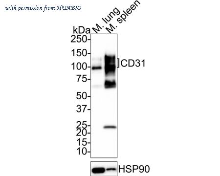 Western blot analysis of CD31 on different lysates with Mouse anti-CD31 antibody (M1511-8) at 1/500 dilution. Lane 1: Mouse lung tissue lysate (no heat) Lane 2: Mouse spleen tissue lysate (no heat) Notice: no heat means the lysate is not boiled. Lysates/proteins at 20 µg/Lane. Predicted band size: 83 kDa Observed band size: 83-130 kDa Exposure time: 5 minutes; 4-20% SDS-PAGE gel. Proteins were transferred to a PVDF membrane and blocked with 5% NFDM/TBST for 1 hour at room temperature. The primary antibody (M1511-8) at 1/500 dilution was used in 5% NFDM/TBST at room temperature for 2 hours. Goat Anti-Mouse IgG - HRP Secondary Antibody (HA1006) at 1/100,000 dilution was used for 1 hour at room temperature.