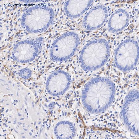 Immunohistochemical analysis of paraffin-embedded human appendix tissue with Rabbit anti-CD31 antibody (HA723897) at 1/1,000 dilution. The section was pre-treated using heat mediated antigen retrieval with Tris-EDTA buffer (pH 9.0) for 20 minutes. The tissues were blocked in 1% BSA for 20 minutes at room temperature, washed with ddH2O and PBS, and then probed with the primary antibody (HA723897) at 1/1,000 dilution for 1 hour at room temperature. The detection was performed using an HRP conjugated compact polymer system. DAB was used as the chromogen. Tissues were counterstained with hematoxylin and mounted with DPX.