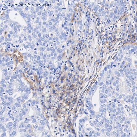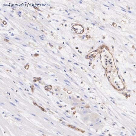 Immunohistochemical analysis of paraffin-embedded human gastric cancer tissue with Rat anti-CD31 antibody (HA610349) at 1/1,000 dilution. The section was pre-treated using heat mediated antigen retrieval with Tris-EDTA buffer (pH 9.0) for 20 minutes. The tissues were blocked in 1% BSA for 20 minutes at room temperature, washed with ddH2O and PBS, and then probed with the primary antibody (HA610349) at 1/1,000 dilution for 1 hour at room temperature. The detection was performed using an HRP conjugated compact polymer system. DAB was used as the chromogen. Tissues were counterstained with hematoxylin and mounted with DPX.