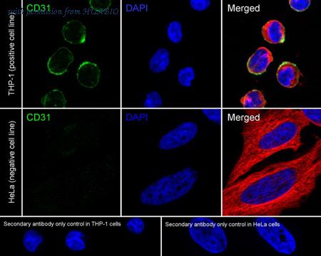 Immunocytochemistry analysis of THP-1 (positive) and HeLa (negative) labeling CD31 with Mouse anti-CD31 antibody (HA601240) at 1/100 dilution. Cells were fixed in 4% paraformaldehyde for 20 minutes at room temperature, permeabilized with 0.1% Triton X-100 in PBS for 5 minutes at room temperature, then blocked with 1% BSA in 10% negative goat serum for 1 hour at room temperature. Cells were then incubated with Mouse anti-CD31 antibody (HA601240) at 1/100 dilution in 1% BSA in PBST overnight at 4 ℃. Goat Anti-Mouse IgG H&L (iFluor™ 488, HA1125) was used as the secondary antibody at 1/1,000 dilution. PBS instead of the primary antibody was used as the secondary antibody only control. Nuclear DNA was labelled in blue with DAPI. beta Tubulin (ET1602-4, red) was stained at 1/100 dilution overnight at +4℃. Goat Anti-Rabbit IgG H&L (iFluor™ 594, HA1122) were used as the secondary antibody at 1/1,000 dilution.