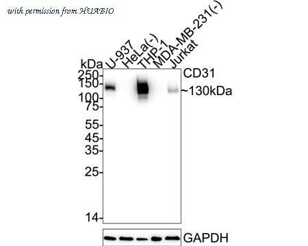 Western blot analysis of CD31 on different lysates with Rabbit anti-CD31 antibody (HA751615) at 1/5,000 dilution. Lane 1: U-937 cell lysate Lane 2: HeLa cell lysate (negative) Lane 3: THP-1 cell lysate Lane 4: MDA-MB-231 cell lysate (negative) Lane 5: Jurkat cell lysate Lysates/proteins at 20 µg/Lane. Predicted band size: 83 kDa Observed band size: 130 kDa Exposure time: 10 seconds; ECL: K1801; 4-20% SDS-PAGE gel. Proteins were transferred to a PVDF membrane and blocked with 5% NFDM/TBST for 1 hour at room temperature. The primary antibody (HA751615) at 1/5,000 dilution was used in primary antibody dilution (K1803) at 4℃ overnight. Goat Anti-Rabbit IgG - HRP Secondary Antibody (HA1001) at 1/50,000 dilution was used for 1 hour at room temperature.