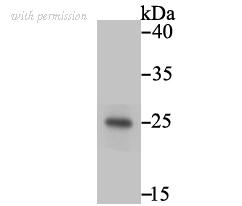 Western blot analysis of PLGF on JAR cell lysates. Proteins were transferred to a PVDF membrane and blocked with 5% BSA in PBS for 1 hour at room temperature. The primary antibody (ET1704-99, 1/500) was used in 5% BSA at room temperature for 2 hours. Goat Anti-Rabbit IgG - HRP Secondary Antibody (HA1001) at 1:200,000 dilution was used for 1 hour at room temperature.