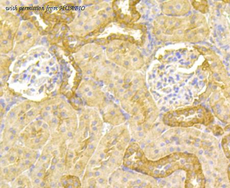 Immunohistochemical analysis of paraffin-embedded rat kidney tissue using anti-PLGF antibody. The section was pre-treated using heat mediated antigen retrieval with Tris-EDTA buffer (pH 8.0-8.4) for 20 minutes.The tissues were blocked in 5% BSA for 30 minutes at room temperature, washed with ddH2O and PBS, and then probed with the primary antibody (ET1704-99, 1/50) for 30 minutes at room temperature. The detection was performed using an HRP conjugated compact polymer system. DAB was used as the chromogen. Tissues were counterstained with hematoxylin and mounted with DPX.