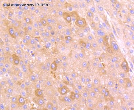 Immunohistochemical analysis of paraffin-embedded human liver carcinoma tissue using anti-PLGF antibody. The section was pre-treated using heat mediated antigen retrieval with Tris-EDTA buffer (pH 8.0-8.4) for 20 minutes.The tissues were blocked in 5% BSA for 30 minutes at room temperature, washed with ddH2O and PBS, and then probed with the primary antibody (ET1704-99, 1/50) for 30 minutes at room temperature. The detection was performed using an HRP conjugated compact polymer system. DAB was used as the chromogen. Tissues were counterstained with hematoxylin and mounted with DPX.