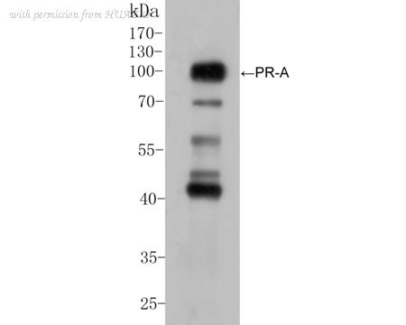 Western blot analysis of Progesterone receptor on AN3CA cell lysate. Proteins were transferred to a PVDF membrane and blocked with 5% BSA in PBS for 1 hour at room temperature. The primary antibody (ER1901-96, 1/100) was used in 5% BSA at room temperature for 2 hours. Goat Anti-Rabbit IgG - HRP Secondary Antibody (HA1001) at 1:5,000 dilution was used for 1 hour at room temperature.