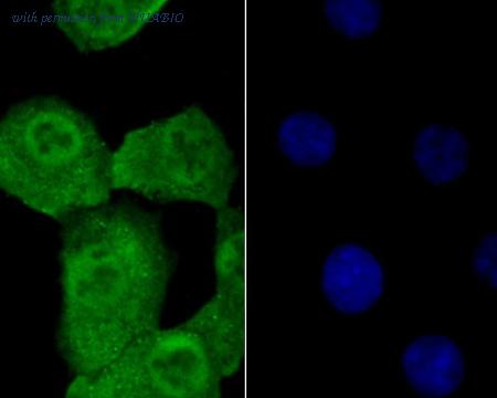 ICC staining Progesterone Receptor in Hela cells (green). The nuclear counter stain is DAPI (blue). Cells were fixed in paraformaldehyde, permeabilised with 0.25% Triton X100/PBS.