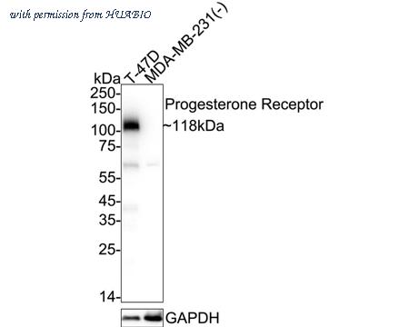 Western blot analysis of Progesterone Receptor on different lysates with Rabbit anti-Progesterone Receptor antibody (ET1702-24) at 1/1,000 dilution. Lane 1: T-47D cell lysate Lane 2: MDA-MB-231 cell lysate (negative) Lysates/proteins at 20 µg/Lane. Predicted band size: 99 kDa Observed band size: 118 kDa Exposure time: 9 seconds; 4-20% SDS-PAGE gel. Proteins were transferred to a PVDF membrane and blocked with 5% NFDM/TBST for 1 hour at room temperature. The primary antibody (ET1702-24) at 1/1,000 dilution was used in 5% NFDM/TBST at 4℃ overnight. Goat Anti-Rabbit IgG - HRP Secondary Antibody (HA1001) at 1/50,000 dilution was used for 1 hour at room temperature.