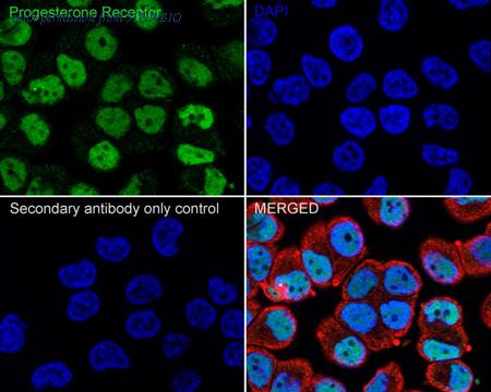Immunocytochemistry analysis of T-47D cells labeling Progesterone Receptor with Rabbit anti-Progesterone Receptor antibody (ET1702-24) at 1/100 dilution. Cells were fixed in 4% paraformaldehyde for 20 minutes at room temperature, permeabilized with 0.1% Triton X-100 in PBS for 5 minutes at room temperature, then blocked with 1% BSA in 10% negative goat serum for 1 hour at room temperature. Cells were then incubated with Rabbit anti-Progesterone Receptor antibody (ET1702-24) at 1/100 dilution in 1% BSA in PBST overnight at 4 ℃. Goat Anti-Rabbit IgG H&L (iFluor™ 488, HA1121) was used as the secondary antibody at 1/1,000 dilution. PBS instead of the primary antibody was used as the secondary antibody only control. Nuclear DNA was labelled in blue with DAPI. Beta tubulin (M1305-2, red) was stained at 1/100 dilution overnight at +4℃. Goat Anti-Mouse IgG H&L (iFluor™ 594, HA1126) was used as the secondary antibody at 1/1,000 dilution.