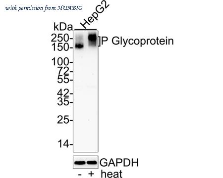 Western blot analysis of P Glycoprotein on different lysates with Rabbit anti-P Glycoprotein antibody (HA750249) at 1/1,000 dilution. Lane 1: Hela-si NT(no heat) cell lysate Lane 2: Hela-si P Glycoprotein(no heat) cell lysate Notice: no heat means the lysate is not boiled. Lysates/proteins at 10 µg/Lane. Predicted band size: 141 kDa Observed band size: 180 kDa Exposure time: 3 minutes; 4-20% SDS-PAGE gel. ET1611-30 was shown to specifically react with P Glycoprotein in Hela-si NT cells. Weakened band was observed when Hela-si P Glycoprotein sample was tested. Hela-si NT and Hela-si P Glycoprotein samples were subjected to SDS-PAGE. Proteins were transferred to a PVDF membrane and blocked with 5% NFDM in TBST for 1 hour at room temperature. The primary antibody (ET1611-30, 1/1,000) and Loading control antibody (Rabbit anti-GAPDH, ET1601-4, 1/10,000) were used in 5% BSA at room temperature for 2 hours. Goat Anti-rabbit IgG-HRP Secondary Antibody (HA1001) at 1:100,000 dilution was used for 1 hour at room temperature.