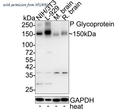 Western blot analysis of P Glycoprotein on different lysates with Rabbit anti-P Glycoprotein antibody (ET1611-30) at 1/1,000 dilution. Lane 1: NIH/3T3 cell lysate (no heat) Lane 2: L-929 cell lysate (no heat) Lane 3: Mouse brain tissue lysate (no heat) Lane 4: Rat brain tissue lysate (no heat) Notice: no heat means the lysate is not boiled. Lysates/proteins at 20 µg/Lane. Predicted band size: 141 kDa Observed band size: 150 kDa Exposure time: 1 minute 59 seconds; ECL: K1802; 4-20% SDS-PAGE gel. Proteins were transferred to a PVDF membrane and blocked with 5% NFDM/TBST for 1 hour at room temperature. The primary antibody (ET1611-30) at 1/1,000 dilution was used in 5% NFDM/TBST at 4℃ overnight. Goat Anti-Rabbit IgG - HRP Secondary Antibody (HA1001) at 1/50,000 dilution was used for 1 hour at room temperature.