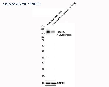 Western blot analysis of P Glycoprotein on different lysates with Rabbit anti-P Glycoprotein antibody (ET1611-30) at 1/1,000 dilution. Lane 1: Hela-si NT(no heat) cell lysate Lane 2: Hela-si P Glycoprotein(no heat) cell lysate Notice: no heat means the lysate is not boiled. Lysates/proteins at 10 µg/Lane. Predicted band size: 141 kDa Observed band size: 180 kDa Exposure time: 3 minutes; 4-20% SDS-PAGE gel. ET1611-30 was shown to specifically react with P Glycoprotein in Hela-si NT cells. Weakened band was observed when Hela-si P Glycoprotein sample was tested. Hela-si NT and Hela-si P Glycoprotein samples were subjected to SDS-PAGE. Proteins were transferred to a PVDF membrane and blocked with 5% NFDM in TBST for 1 hour at room temperature. The primary antibody (ET1611-30, 1/1,000) and Loading control antibody (Rabbit anti-GAPDH, ET1601-4, 1/10,000) were used in 5% BSA at room temperature for 2 hours. Goat Anti-rabbit IgG-HRP Secondary Antibody (HA1001) at 1:100,000 dilution was used for 1 hour at room temperature.