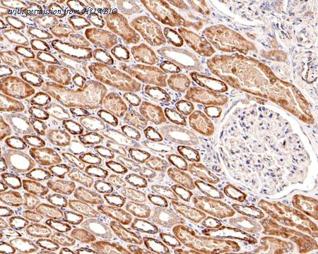 Immunohistochemical analysis of paraffin-embedded human kidney tissue with Mouse anti-P Glycoprotein antibody (HA601312) at 1/5,000 dilution. The section was pre-treated using heat mediated antigen retrieval with Tris-EDTA buffer (pH 9.0) for 20 minutes. The tissues were blocked in 1% BSA for 20 minutes at room temperature, washed with ddH2O and PBS, and then probed with the primary antibody (HA601312) at 1/5,000 dilution for 1 hour at room temperature. The detection was performed using an HRP conjugated compact polymer system. DAB was used as the chromogen. Tissues were counterstained with hematoxylin and mounted with DPX.