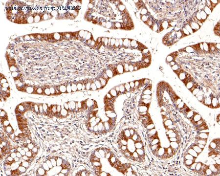 Immunohistochemical analysis of paraffin-embedded human colon cancer tissue with Mouse anti-P Glycoprotein antibody (HA601313) at 1/5,000 dilution. The section was pre-treated using heat mediated antigen retrieval with Tris-EDTA buffer (pH 9.0) for 20 minutes. The tissues were blocked in 1% BSA for 20 minutes at room temperature, washed with ddH2O and PBS, and then probed with the primary antibody (HA601313) at 1/5,000 dilution for 1 hour at room temperature. The detection was performed using an HRP conjugated compact polymer system. DAB was used as the chromogen. Tissues were counterstained with hematoxylin and mounted with DPX.