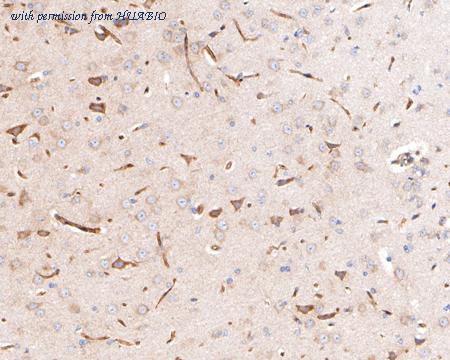 Immunohistochemical analysis of paraffin-embedded rat brain tissue using anti-P Glycoprotein antibody. The section was pre-treated using heat mediated antigen retrieval with Tris-EDTA buffer (pH 9.0) for 20 minutes.The tissues were blocked in 1% BSA for 30 minutes at room temperature, washed with ddH2O and PBS, and then probed with the primary antibody (HA500502, 1/1,000) for 30 minutes at room temperature. The detection was performed using an HRP conjugated compact polymer system. DAB was used as the chromogen. Tissues were counterstained with hematoxylin and mounted with DPX.
