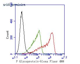 Flow cytometric analysis of P Glycoprotein was done on SH-SY5Y cells. The cells were fixed, permeabilized and stained with the primary antibody (HA500502, 1ug/ml) (red) compared with Rabbit IgG, monoclonal - Isotype Control ( green). After incubation of the primary antibody at room temperature for an hour, the cells were stained with a Alexa Fluor®488 conjugate-Goat anti-Rabbit IgG Secondary antibody at 1/1000 dilution for 30 minutes.Unlabelled sample was used as a control (cells without incubation with primary antibody; black).