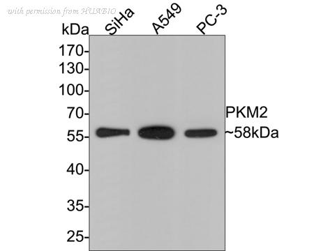 Western blot analysis of PKM2 on different lysates with Rabbit anti-PKM2 antibody (ER1802-70) at 1/500 dilution. Lane 1: SiHa cell lysate Lane 2: A549 cell lysate Lane 3: PC-3 cell lysate Lysates/proteins at 10 µg/Lane. Predicted band size: 58 kDa Observed band size: 58 kDa Exposure time: 2 minutes; 10% SDS-PAGE gel. Proteins were transferred to a PVDF membrane and blocked with 5% NFDM/TBST for 1 hour at room temperature. The primary antibody (ER1802-70) at 1/500 dilution was used in 5% NFDM/TBST at room temperature for 2 hours. Goat Anti-Rabbit IgG - HRP Secondary Antibody (HA1001) at 1:300,000 dilution was used for 1 hour at room temperature.