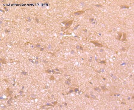 Immunohistochemical analysis of paraffin-embedded rat brain tissue using anti-Tissue type plasminogen activator antibody. The section was pre-treated using heat mediated antigen retrieval with Tris-EDTA buffer (pH 9.0) for 20 minutes.The tissues were blocked in 1% BSA for 30 minutes at room temperature, washed with ddH2O and PBS, and then probed with the primary antibody (HA750338, 1/50) for 30 minutes at room temperature. The detection was performed using an HRP conjugated compact polymer system. DAB was used as the chromogen. Tissues were counterstained with hematoxylin and mounted with DPX.