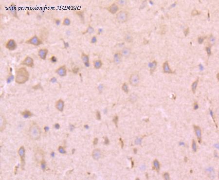 Immunohistochemical analysis of paraffin-embedded mouse brain tissue using anti-Tissue type plasminogen activator antibody. The section was pre-treated using heat mediated antigen retrieval with Tris-EDTA buffer (pH 9.0) for 20 minutes.The tissues were blocked in 1% BSA for 30 minutes at room temperature, washed with ddH2O and PBS, and then probed with the primary antibody (HA750338, 1/50) for 30 minutes at room temperature. The detection was performed using an HRP conjugated compact polymer system. DAB was used as the chromogen. Tissues were counterstained with hematoxylin and mounted with DPX.