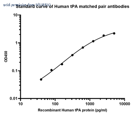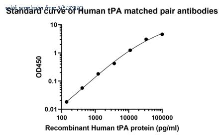 Sandwich ELISA analysis of Human tPA matched pair antibodies Capture: HA725115, Human tPA Rabbit mAb [PSH13-10] Detector: HA725116, Human tPA Rabbit mAb [PSH13-11] Elisa assay was performed by coating wells of a 96-well plate with 100 µl per well of capture antibody (HA725115) diluted in carbonate/bicarbonate buffer, at a concentration of 5 µg/mL overnight at 4℃. Wells of the plate were washed, blocked with 150 µl 0.05% tween-20 1% BSA blocking buffer, and incubated with serial diluted Recombinant Human tPA protein (HA211026) starting from 5,000 pg/ml to 0 pg/ml and detect antibody (HA725116, Biotin, 0.2 µg/ml) for 1 hour at 30℃ with shaking. Then the plate was washed and incubated with 100 µl per well of SA-HRP for 0.5 hour at 30℃ with shaking. Detection was performed using an Ultra TMB Substrate for 10 minutes at room temperature in the dark. The reaction was stopped with sulfuric acid and absorbances were read on a spectrophotometer at 450 nm.
