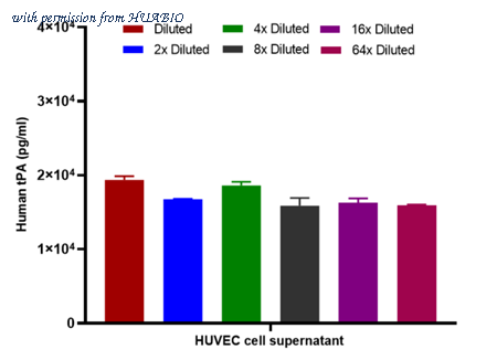 Interpolated concentrations of native tPA in HUVEC cell supernatant Capture: HA725115, Human tPA Rabbit mAb [PSH13-10] Detector: HA725116, Human tPA Rabbit mAb [PSH13-11] Interpolated concentration of native tPA was measured in duplicate at different sample concentrations. The interpolated dilution factor corrected values were plotted (mean +/- SD, n=2). The mean tPA concentration was determined to be 17124 pg/mL in HUVEC cell culture supernatant.