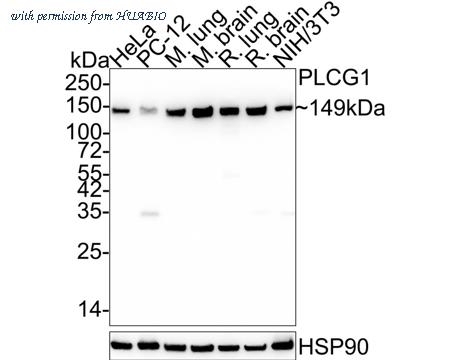 Western blot analysis of PLC-gamma-1 on different lysates with Rabbit anti-PLC-gamma-1 antibody (ET1611-25) at 1/1,000 dilution. Lane 1: HeLa cell lysate (20 µg/Lane) Lane 2: PC-12 cell lysate (20 µg/Lane) Lane 3: Mouse lung tissue lysate (40 µg/Lane) Lane 4: Mouse brain tissue lysate (40 µg/Lane) Lane 5: Rat lung tissue lysate (40 µg/Lane) Lane 6: Rat brain tissue lysate (40 µg/Lane) Lane 7: NIH/3T3 cell lysate (20 µg/Lane) Predicted band size: 149 kDa Observed band size: 149 kDa Exposure time: 50 seconds; 4-20% SDS-PAGE gel. Proteins were transferred to a PVDF membrane and blocked with 5% NFDM/TBST for 1 hour at room temperature. The primary antibody (ET1611-25) at 1/1,000 dilution was used in 5% NFDM/TBST at 4℃ overnight. Goat Anti-Rabbit IgG - HRP Secondary Antibody (HA1001) at 1/50,000 dilution was used for 1 hour at room temperature.