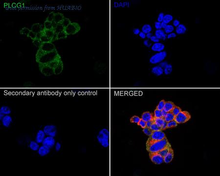 Immunocytochemistry analysis of PC-12 cells labeling PLC-gamma-1 with Rabbit anti-PLC-gamma-1 antibody (ET1611-25) at 1/50 dilution. Cells were fixed in 4% paraformaldehyde for 20 minutes at room temperature, permeabilized with 0.1% Triton X-100 in PBS for 5 minutes at room temperature, then blocked with 1% BSA in 10% negative goat serum for 1 hour at room temperature. Cells were then incubated with Rabbit anti-PLC-gamma-1 antibody (ET1611-25) at 1/50 dilution in 1% BSA in PBST overnight at 4 ℃. Goat Anti-Rabbit IgG H&L (iFluor™ 488, HA1121) was used as the secondary antibody at 1/1,000 dilution. PBS instead of the primary antibody was used as the secondary antibody only control. Nuclear DNA was labelled in blue with DAPI. Beta tubulin (M1305-2, red) was stained at 1/100 dilution overnight at +4℃. Goat Anti-Mouse IgG H&L (iFluor™ 594, HA1126) was used as the secondary antibody at 1/1,000 dilution.