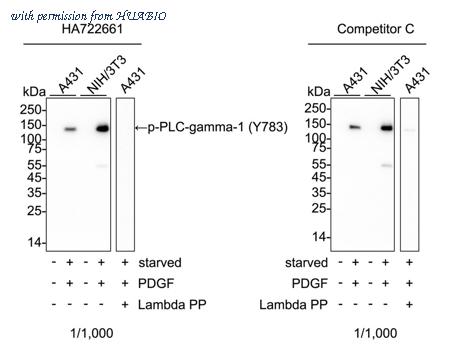 Western blot analysis of Phospho-PLC-gamma-1 (Y783) on different lysates with Rabbit anti-Phospho-PLC-gamma-1 (Y783) antibody (HA751066) at 1/1,000 dilution and competitor's antibody at 1/1,000 dilution. Lane 1: A431 cell lysate Lane 2: A431 starved overnight then add 20ng/mL EGF for 5 minutes cell lysate Lane 3: NIH/3T3 cell lysate Lane 4: NIH/3T3 starved overnight then add 100ng/mL PDGF for 5 minutes cell lysate Lane 5: A431 starved overnight then add 20ng/mL EGF for 5 minutes cell lysate, then the membrane treated with λpp for 1 hour Lysates/proteins at 20 µg/Lane. Predicted band size: 149 kDa Observed band size: 149 kDa Exposure time: 3 minutes; ECL: K1801; 4-20% SDS-PAGE gel. Proteins were transferred to a PVDF membrane and blocked with 5% NFDM/TBST for 1 hour at room temperature. The primary antibody (HA751066) at 1/1,000 dilution and competitor's antibody at 1/1,000 dilution were used in 5% NFDM/TBST at 4℃ overnight. Goat Anti-Rabbit IgG - HRP Secondary Antibody (HA1001) at 1/50,000 dilution was used for 1 hour at room temperature.