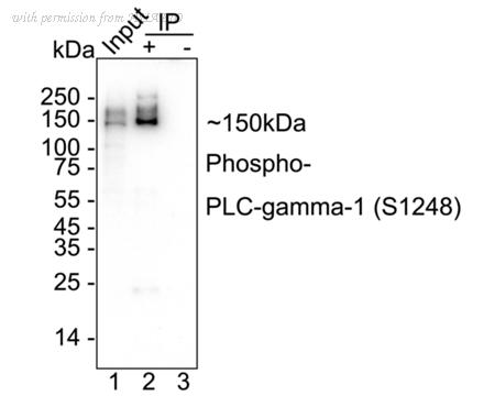 Phospho-PLC-gamma-1 (S1248) was immunoprecipitated from 0.2 mg A431 starved overnight then add 20ng/mL EGF for 5 minutes cell lysate with HA723551 at 2 µg/10 µl beads. Western blot was performed from the immunoprecipitate using HA723551 at 1/2,000 dilution. HRP Conjugated Anti-Rabbit IgG for IP Nano-secondary antibody at 1/5,000 dilution was used for 1 hour at room temperature. Lane 1: A431 starved overnight then add 20ng/mL EGF for 5 minutes cell lysate (input) Lane 2: HA723551 IP in A431 starved overnight then add 20ng/mL EGF for 5 minutes cell lysate Lane 3: Rabbit IgG instead of HA723551 in A431 starved overnight then add 20ng/mL EGF for 5 minutes cell lysate Blocking/Dilution buffer: 5% NFDM/TBST Exposure time: 1 minute 7 seconds; ECL: K1801