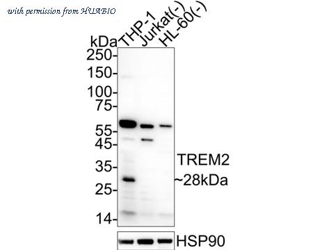 Western blot analysis of TREM2 on different lysates with Rabbit anti-TREM2 antibody (ER1902-96) at 1/1,000 dilution. Lane 1: THP-1 cell lysate Lane 2: Jurkat cell lysate (negative) Lane 3: HL-60 cell lysate (negative) Lysates/proteins at 20 µg/Lane. Predicted band size: 25 kDa Observed band size: 28 kDa Exposure time: 59 seconds; ECL: K1801; 4-20% SDS-PAGE gel. Proteins were transferred to a PVDF membrane and blocked with 5% NFDM/TBST for 1 hour at room temperature. The primary antibody (ER1902-96) at 1/1,000 dilution was used in 5% NFDM/TBST at 4℃ overnight. Goat Anti-Rabbit IgG - HRP Secondary Antibody (HA1001) at 1/50,000 dilution was used for 1 hour at room temperature.