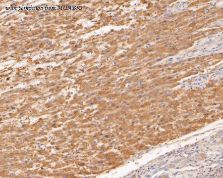 Immunohistochemical analysis of paraffin-embedded human liver carcinoma tissue using anti-TREM2 antibody. The section was pre-treated using heat mediated antigen retrieval with Tris-EDTA buffer (pH 8.0-8.4) for 20 minutes.The tissues were blocked in 5% BSA for 30 minutes at room temperature, washed with ddH2O and PBS, and then probed with the primary antibody (ER1902-96, 1/50) for 30 minutes at room temperature. The detection was performed using an HRP conjugated compact polymer system. DAB was used as the chromogen. Tissues were counterstained with hematoxylin and mounted with DPX.