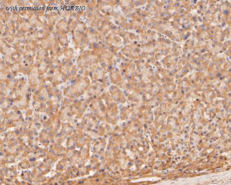 Immunohistochemical analysis of paraffin-embedded human liver tissue using anti-TREM2 antibody. The section was pre-treated using heat mediated antigen retrieval with Tris-EDTA buffer (pH 8.0-8.4) for 20 minutes.The tissues were blocked in 5% BSA for 30 minutes at room temperature, washed with ddH2O and PBS, and then probed with the primary antibody (ER1902-96, 1/50) for 30 minutes at room temperature. The detection was performed using an HRP conjugated compact polymer system. DAB was used as the chromogen. Tissues were counterstained with hematoxylin and mounted with DPX.