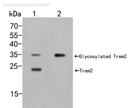 Western blot analysis of TREM2 on different lysates. Proteins were transferred to a PVDF membrane and blocked with 5% BSA in PBS for 1 hour at room temperature. The primary antibody (ER2001-59, 1/500) was used in 5% BSA at room temperature for 2 hours. Goat Anti-Rabbit IgG - HRP Secondary Antibody (HA1001) at 1:5,000 dilution was used for 1 hour at room temperature. Positive control: Lane 1: THP-1 cell lysate Lane 2: Rat bone marrow tissue lysate