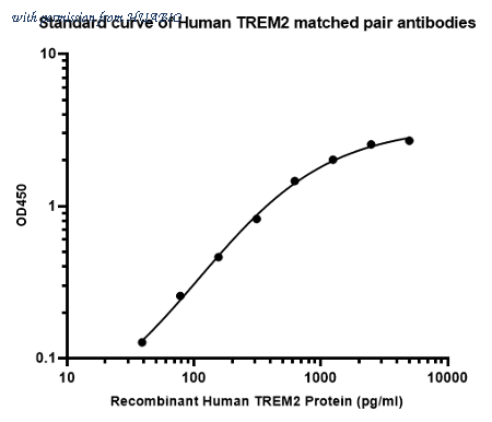 Sandwich ELISA analysis of Human TREM2 matched pair antibodies Elisa assay was performed by coating wells of a 96-well plate with 100 µl per well of capture antibody (HA723150) diluted in carbonate/bicarbonate buffer, at a concentration of 2ug/ml overnight at 4℃. Wells of the plate were washed, blocked with 150 µl 0.05% tween-20 1% BSA blocking buffer, and incubated with serial diluted Recombinant Human TREM2 protein (HA210647) starting from 5,000 pg/ml to 0 pg/ml and detect antibody (HA723149, Biotin, 0.2 µg/ml) for 1 hour at 30℃ with shaking. Then the plate was washed and incubated with 100 µl per well of SA-HRP for 0.5 hour at 30℃ with shaking. Detection was performed using an Ultra TMB Substrate for 10 minutes at room temperature in the dark. The reaction was stopped with sulfuric acid and absorbances were read on a spectrophotometer at 450 nm.