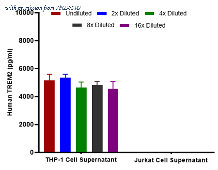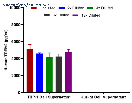 Interpolated concentrations of native TREM2 in human cell culture supernatant samples. Interpolated concentration of native TREM2 was measured in duplicate at different sample concentrations and interpolated from the TREM2 standard curves. Undiluted samples were 50% cell supernatant. The interpolated dilution factor corrected values were plotted (mean +/- SD, n=2). The mean TREM2 concentration was determined to be 4,912 pg/mL in THP-1 cell culture supernatant, undetectable in Jurkat cell culture supernatant.