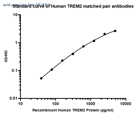 Sandwich ELISA analysis of Human TREM2 matched pair antibodies Elisa assay was performed by coating wells of a 96-well plate with 100 µl per well of capture antibody (HA723149) diluted in carbonate/bicarbonate buffer, at a concentration of 2ug/ml overnight at 4℃. Wells of the plate were washed, blocked with 150 µl 0.05% tween-20 1% BSA blocking buffer, and incubated with serial diluted Recombinant Human TREM2 protein (HA210647) starting from 5,000 pg/ml to 0 pg/ml and detect antibody (HA723151, Biotin, 0.2 µg/ml) for 1 hour at 30℃ with shaking. Then the plate was washed and incubated with 100 µl per well of SA-HRP for 0.5 hour at 30℃ with shaking. Detection was performed using an Ultra TMB Substrate for 10 minutes at room temperature in the dark. The reaction was stopped with sulfuric acid and absorbances were read on a spectrophotometer at 450 nm.