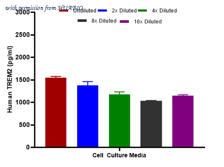 Interpolated concentrations of spiked TREM2 in cell culture media samples. The concentrations of TREM2 were measured in duplicates, interpolated from the TREM2 standard curves and corrected for sample dilution. Undiluted samples are as follows: cell culture media 50%. The interpolated dilution factor corrected values are plotted (mean +/- SD, n=2).