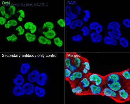 Immunocytochemistry analysis of F9 cells labeling Oct4 with Rabbit anti-Oct4 antibody (ET1612-20) at 1/2,000 dilution. Cells were fixed in 4% paraformaldehyde for 15 minutes at room temperature, permeabilized with 0.1% Triton X-100 in PBS for 15 minutes at room temperature, then blocked with 1% BSA in 10% negative goat serum for 1 hour at room temperature. Cells were then incubated with Rabbit anti-Oct4 antibody (ET1612-20) at 1/2,000 dilution in 1% BSA in PBST overnight at 4 ℃. Goat Anti-Rabbit IgG H&L (iFluor™ 488, HA1121) was used as the secondary antibody at 1/1,000 dilution. PBS instead of the primary antibody was used as the secondary antibody only control. Nuclear DNA was labelled in blue with DAPI. Beta tubulin (HA601187, red) was stained at 1/100 dilution overnight at +4℃. Goat Anti-Mouse IgG H&L (iFluor™ 594, HA1126) was used as the secondary antibody at 1/1,000 dilution.