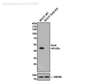Western blot analysis of Oct4 with anti-Oct4 antibody (ET1612-20) at 1/2,000 dilution. Lane 1: Wild-type NCCIT whole cell lysate. Lane 2: Oct4 knockout NCCIT whole cell lysate. Proteins were transferred to a PVDF membrane and blocked with 5% NFDM in TBST for 1 hour at room temperature. The primary Anti-Oct4 antibody (ET1612-20, 1/2,000) and Anti-HSP90 antibody (ET1605-56, 1/10,000) were used in 5% BSA at room temperature for 2 hours. Goat Anti-Rabbit IgG H&L (HRP) Secondary Antibody (HA1001) at 1/50,000 dilution was used for 1 hour at room temperature.