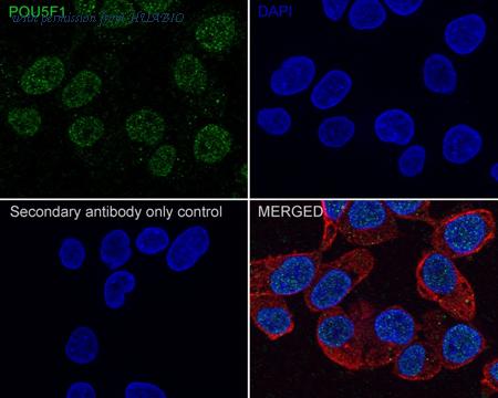 Immunocytochemistry analysis of NCCIT cells labeling Oct4 with Mouse anti-Oct4 antibody (HA610085) at 1/100 dilution. Cells were fixed in 4% paraformaldehyde for 20 minutes at room temperature, permeabilized with 0.1% Triton X-100 in PBS for 5 minutes at room temperature, then blocked with 1% BSA in 10% negative goat serum for 1 hour at room temperature. Cells were then incubated with Mouse anti-Oct4 antibody (HA610085) at 1/100 dilution in 1% BSA in PBST overnight at 4 ℃. Goat Anti-Mouse IgG H&L (iFluor™ 488, HA1125) was used as the secondary antibody at 1/1,000 dilution. PBS instead of the primary antibody was used as the secondary antibody only control. Nuclear DNA was labelled in blue with DAPI. beta Tubulin (ET1602-4, red) was stained at 1/100 dilution overnight at +4℃. Goat Anti-Rabbit IgG H&L (iFluor™ 594, HA1122) were used as the secondary antibody at 1/1,000 dilution.