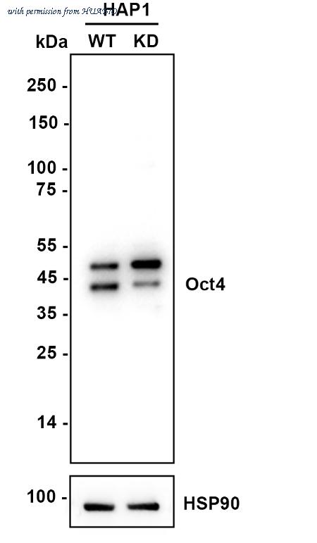 Western blot analysis of Oct4 on different lysates with Mouse anti-Oct4 antibody (HA601207) at 1/1,000 dilution. Lane 1: HAP1-parental cell lysate Lane 2: HAP1-Oct4 KD cell lysate Lysates/proteins at 10 µg/Lane. Predicted band size: 39 kDa Observed band size: 42 kDa Exposure time: 18 seconds; ECL: K1801; 4-20% SDS-PAGE gel. Proteins were transferred to a PVDF membrane and blocked with 5% NFDM/TBST for 1 hour at room temperature. The primary antibody (HA601207) at 1/1,000 dilution was used in 5% NFDM/TBST at 4℃ overnight. Goat Anti-Mouse IgG - HRP Secondary Antibody (HA1006) at 1/50,000 dilution was used for 1 hour at room temperature.