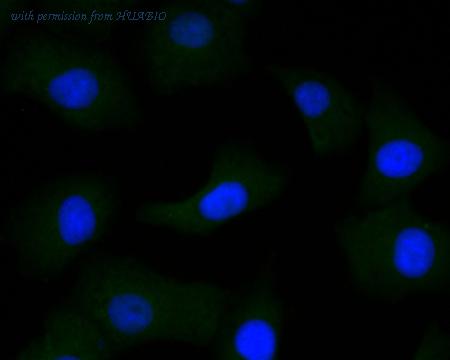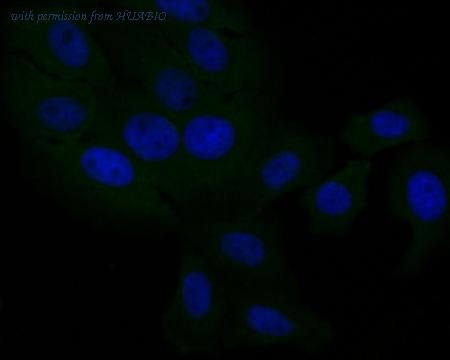 ICC staining of TMEM16A in HepG2 cells (green). Formalin fixed cells were permeabilized with 0.1% Triton X-100 in TBS for 10 minutes at room temperature and blocked with 1% Blocker BSA for 15 minutes at room temperature. Cells were probed with the primary antibody (ER1901-30, 1/50) for 1 hour at room temperature, washed with PBS. Alexa Fluor®488 Goat anti-Rabbit IgG was used as the secondary antibody at 1/1,000 dilution. The nuclear counter stain is DAPI (blue).