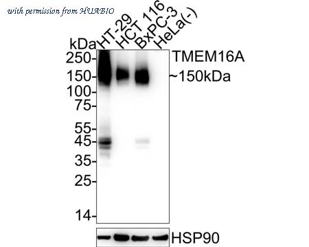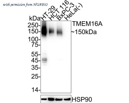 Western blot analysis of TMEM16A on different lysates with Rabbit anti-TMEM16A antibody (HA751085) at 1/1,000 dilution. Lane 1: HT-29 cell lysate Lane 2: HCT 116 cell lysate Lane 3: BxPC-3 cell lysate Lane 4: HeLa cell lysate (negative) Lysates/proteins at 20 µg/Lane. Predicted band size: 114 kDa Observed band size: 150 kDa Exposure time: 10 seconds; ECL: K1801; 4-20% SDS-PAGE gel. Proteins were transferred to a PVDF membrane and blocked with 5% NFDM/TBST for 1 hour at room temperature. The primary antibody (HA751085) at 1/1,000 dilution was used in 5% NFDM/TBST at 4℃ overnight. Goat Anti-Rabbit IgG - HRP Secondary Antibody (HA1001) at 1/50,000 dilution was used for 1 hour at room temperature.